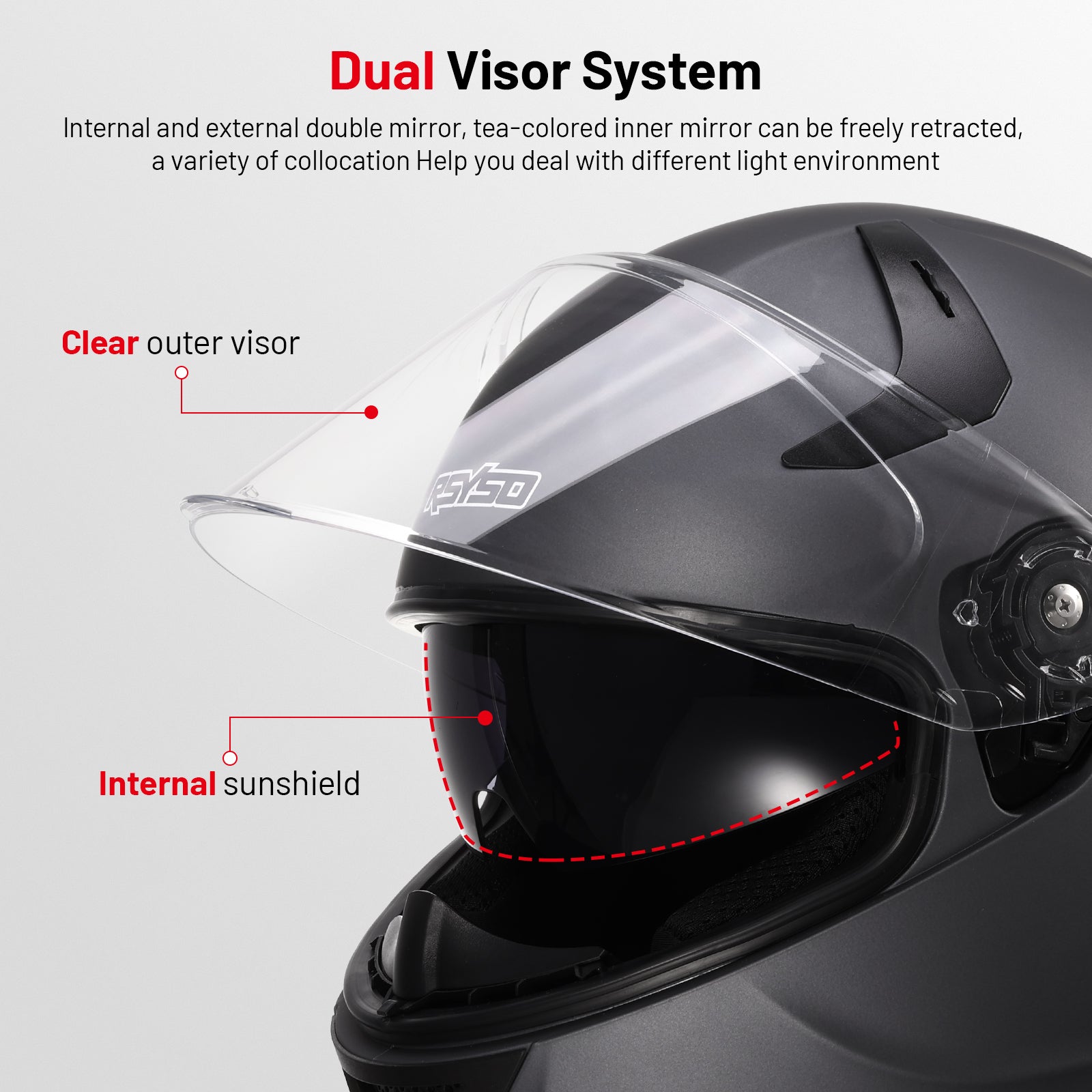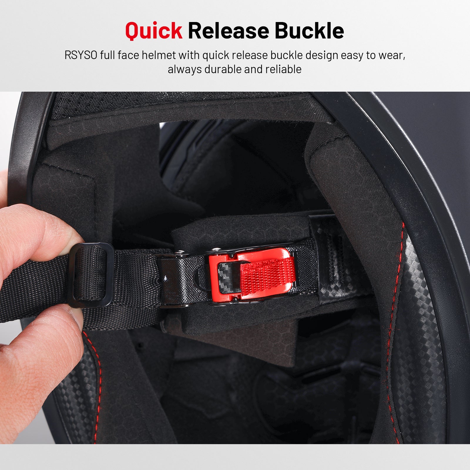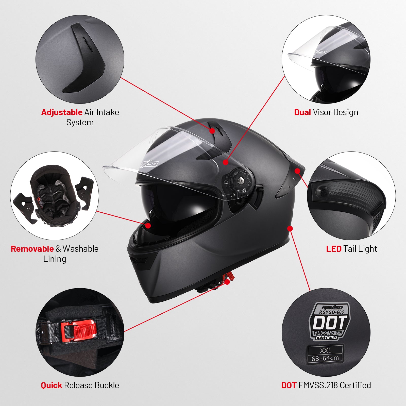 - Outstanding Safety Features - RSYSO full face helmet made with high-strength ABS shell and multi-density EPS lining, equipped with high-strength quick-release buckles, compliant with DOT FMVSS218 safety standards.