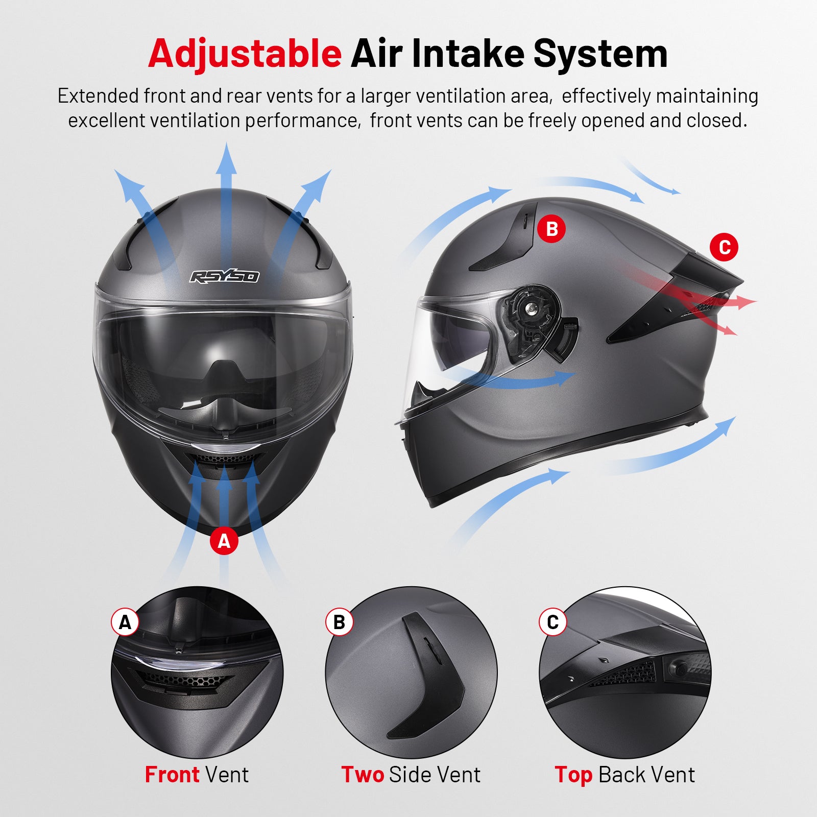 - Adjustable Ventilation System - Headside dual and mouth vents with adjustable switches for controlled airflow, reducing wind noise at high speeds or improve airflow in low speed