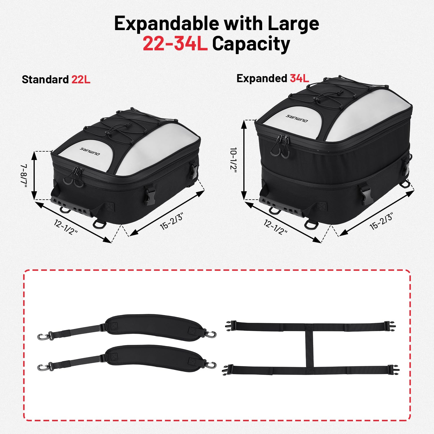 EThe expandable capacity ranges from 22-34L, with this motorcycle tail bag capable of expanding up to 34 liters. It's designed to store clothes, shoes, helmets, and personal items. Compatible with most motorcycle models such as CB600RR, iron883, MT10, FZ07 09, and R1200GS. Note: Not suitable for off-road vehicles and bicycles.