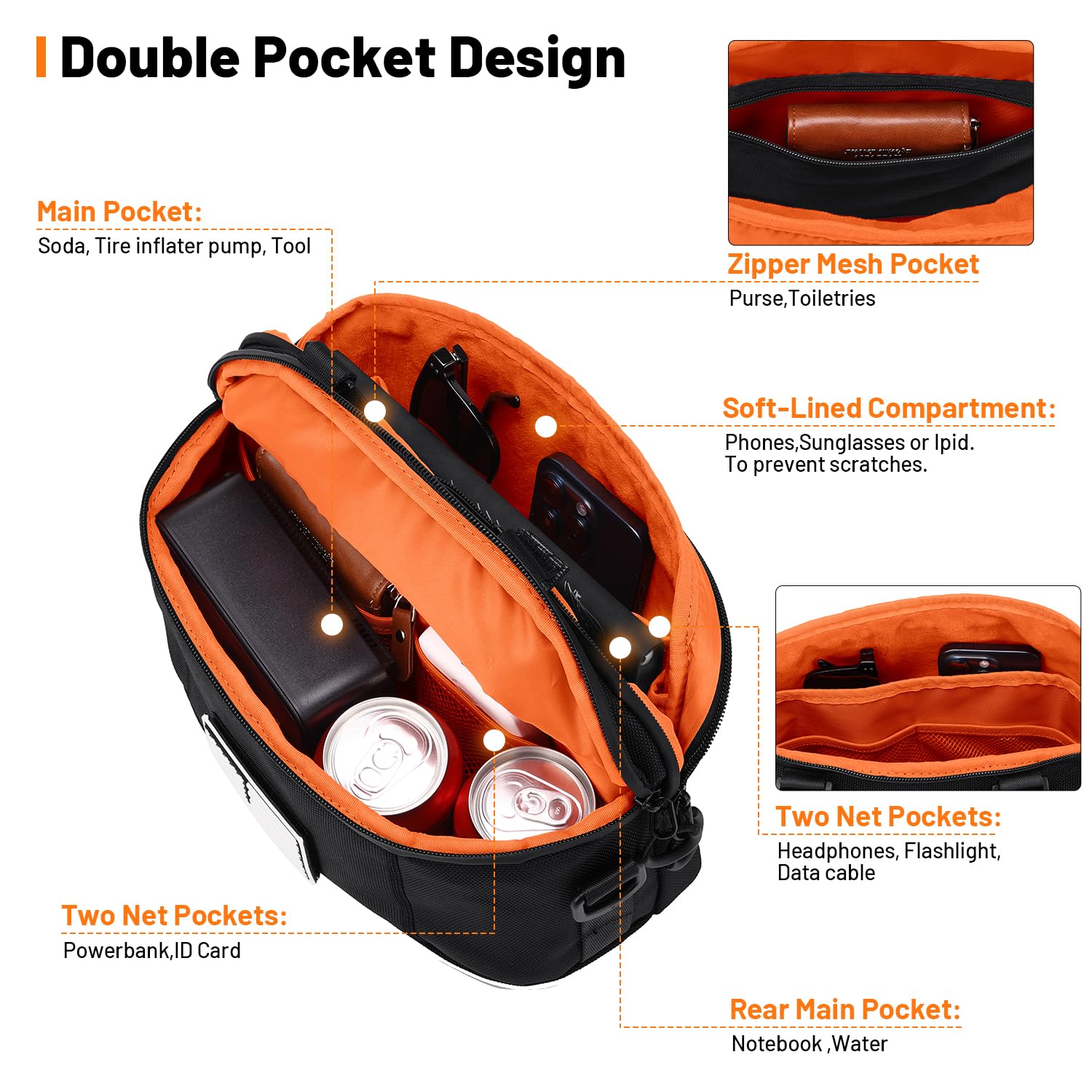Features: Multi-directional position adjustment design, contrasting orange interior, extra pockets, waterproof zippers