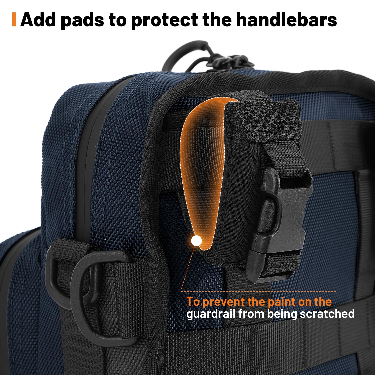 2. This handlebar bag is made of waterproof 1680D Oxford cloth/coated film waterproof Oxford cloth, which is better than 600d, 800d and 1000d materials on the market, which is not only waterproof but also resistant to deformation and fast fading. External waterproof zipper can easily prevent water and dust from entering.
