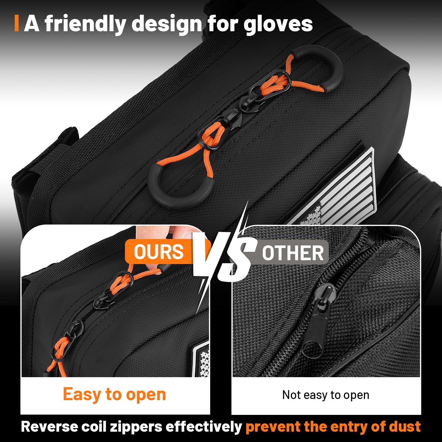 2. This handlebar bag is made of waterproof 1800D Oxford cloth/coated film waterproof Oxford cloth, which is better than 600d, 800d and 1000d materials on the market, which is not only waterproof but also resistant to deformation and fast fading. External waterproof zipper can easily prevent water and dust from entering.