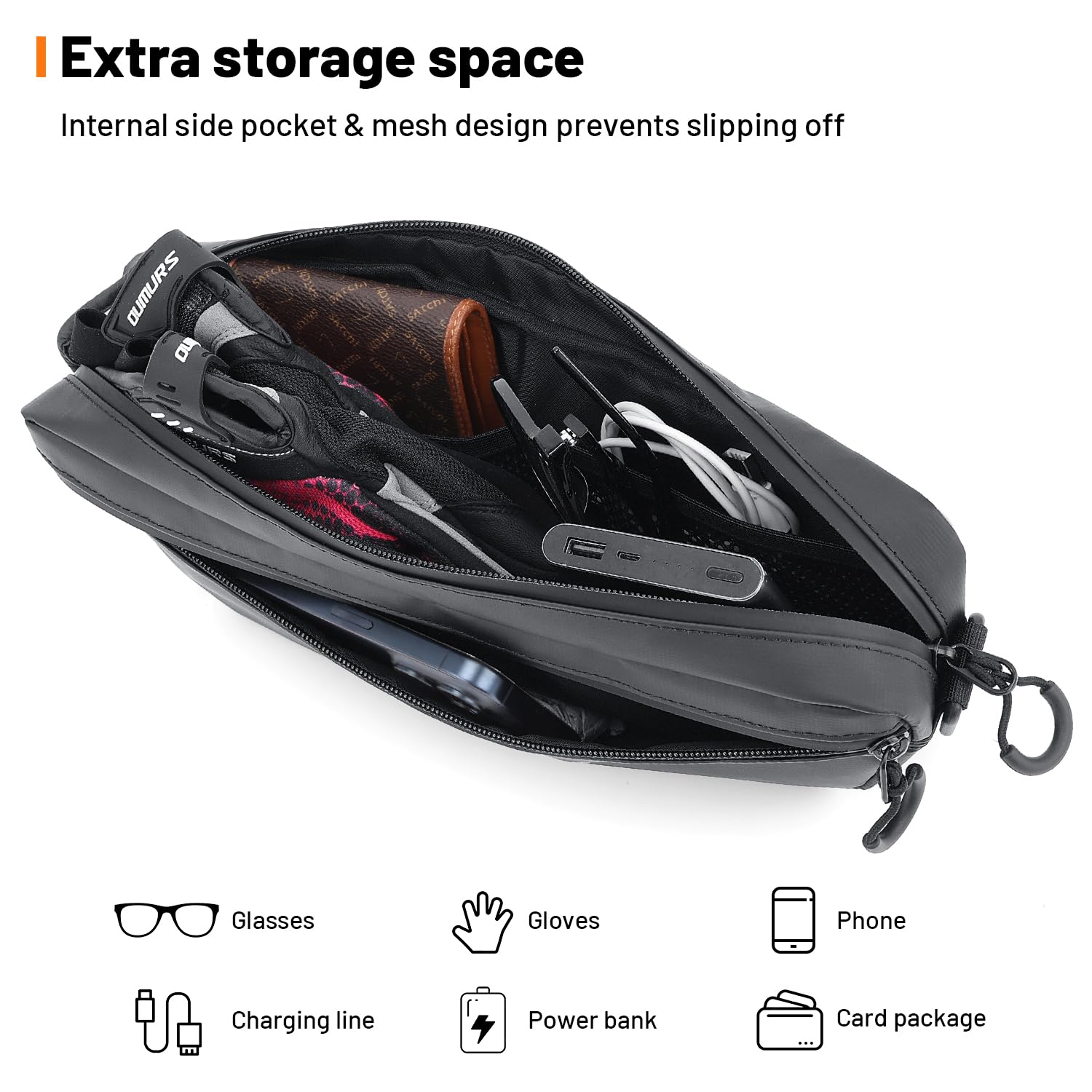 2, the motorcycle handlebar bag has two pockets, small pockets can be put: mobile phone. Large pockets can be put: sunglasses, gloves, card bag, charging cable, charging treasure